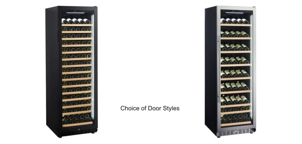 Choice of Door Styles – Both styles of our wine coolers feature a glass door design. Our Full Glass Door option showcases a sleek black frame with the glass covering the entire surface, creating a glossy sheen reminiscent of the back of a smartphone. On the other hand, our Stainless-steel glass door combines a stainless steel frame with a glass insert for a sophisticated look. Rest assured, both door styles come equipped with locks for added security.